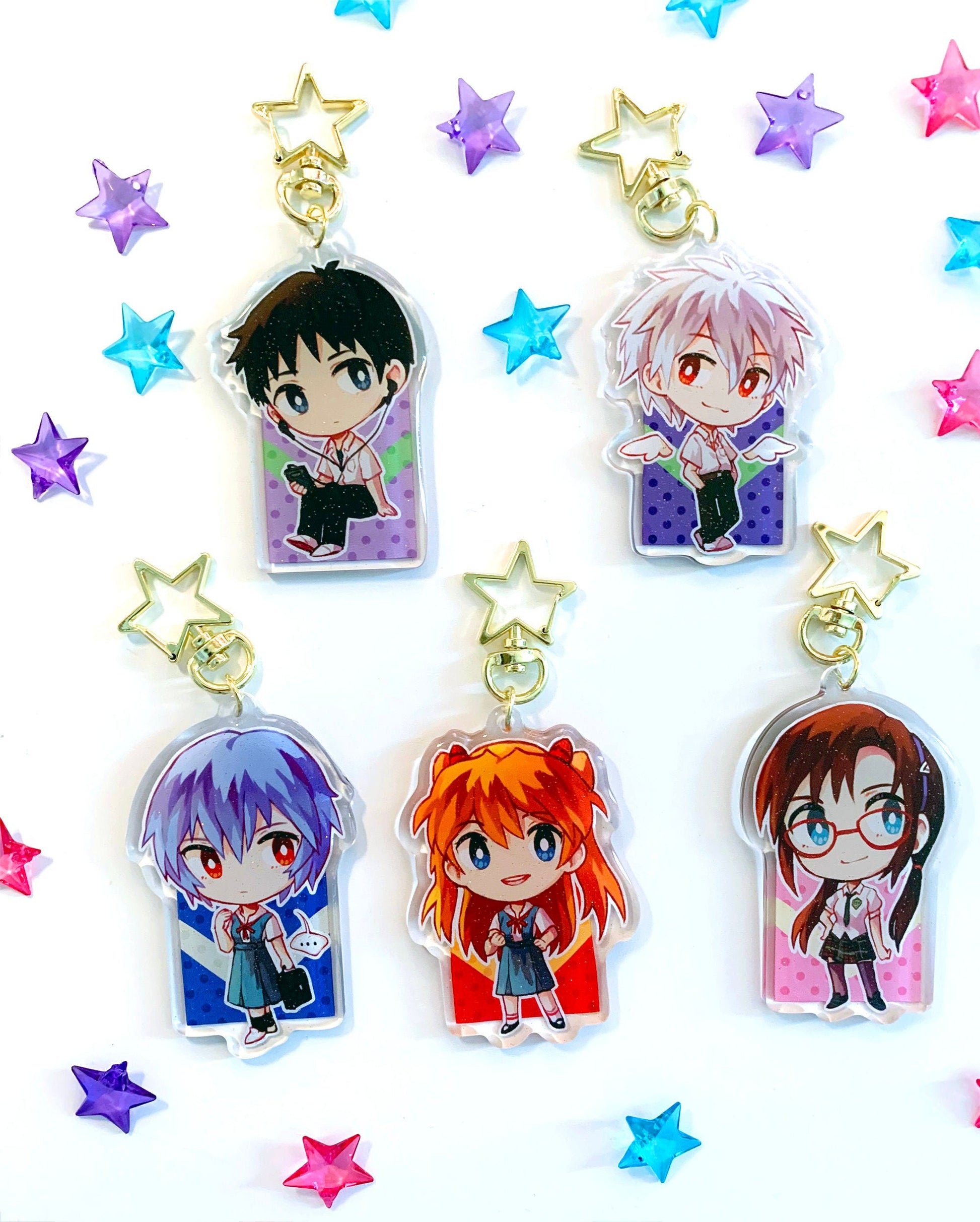 Glittery acrylic charms of Shinji, Kaworu, Rei, Asuka, and Mari from Evangelion! Each charm is double-sided and features different artwork and expressions on the back side.