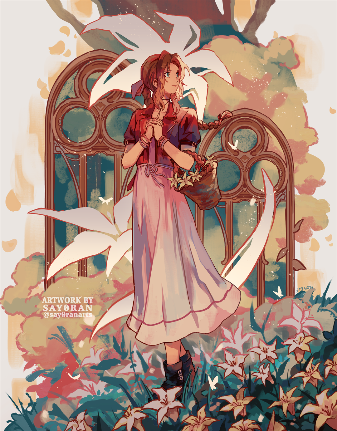 11x14" print (~28cm x 35cm) featuring Aerith from FF7! The artwork is printed on sturdy, 80 lb. light cardstock matte paper.