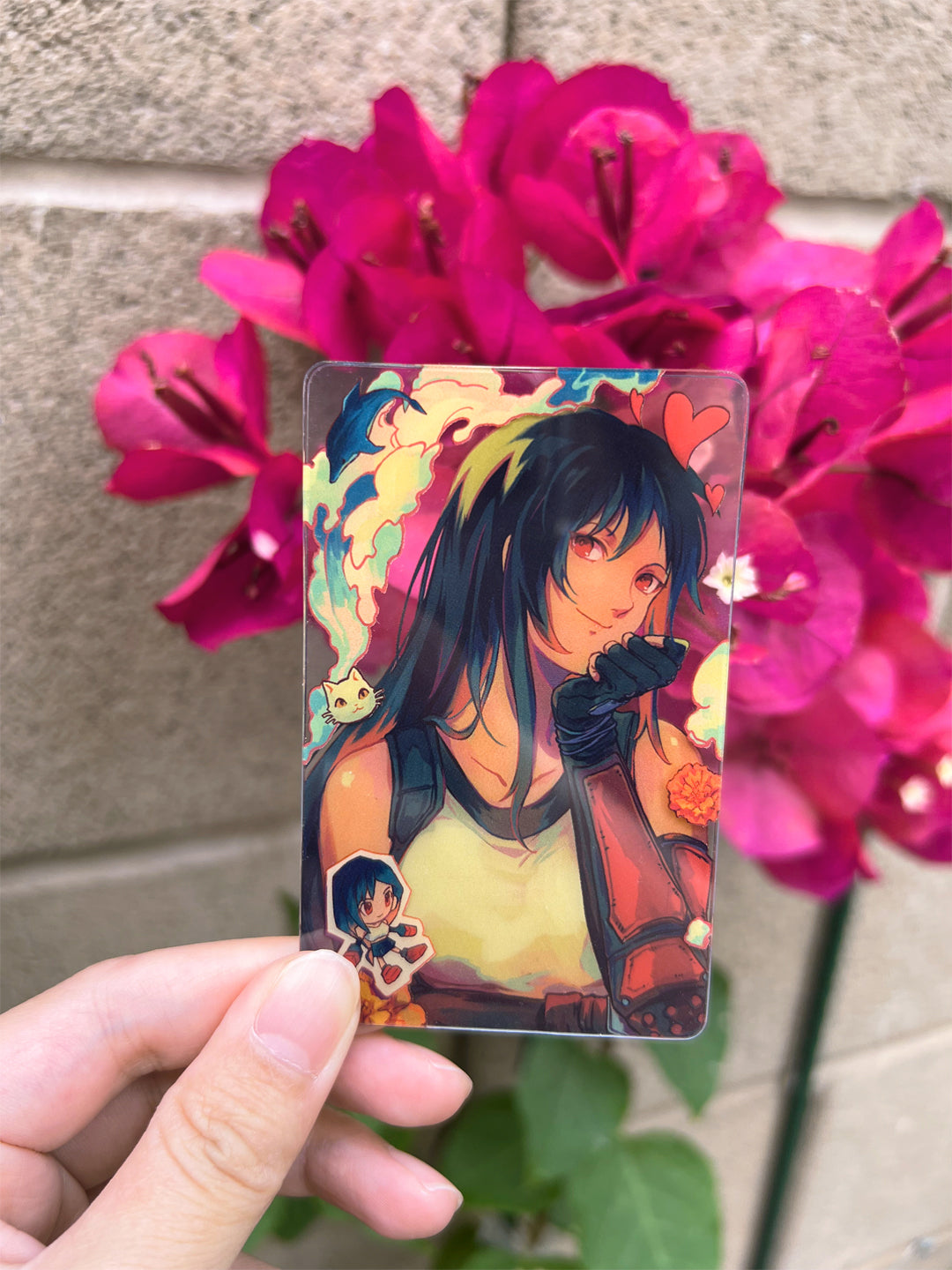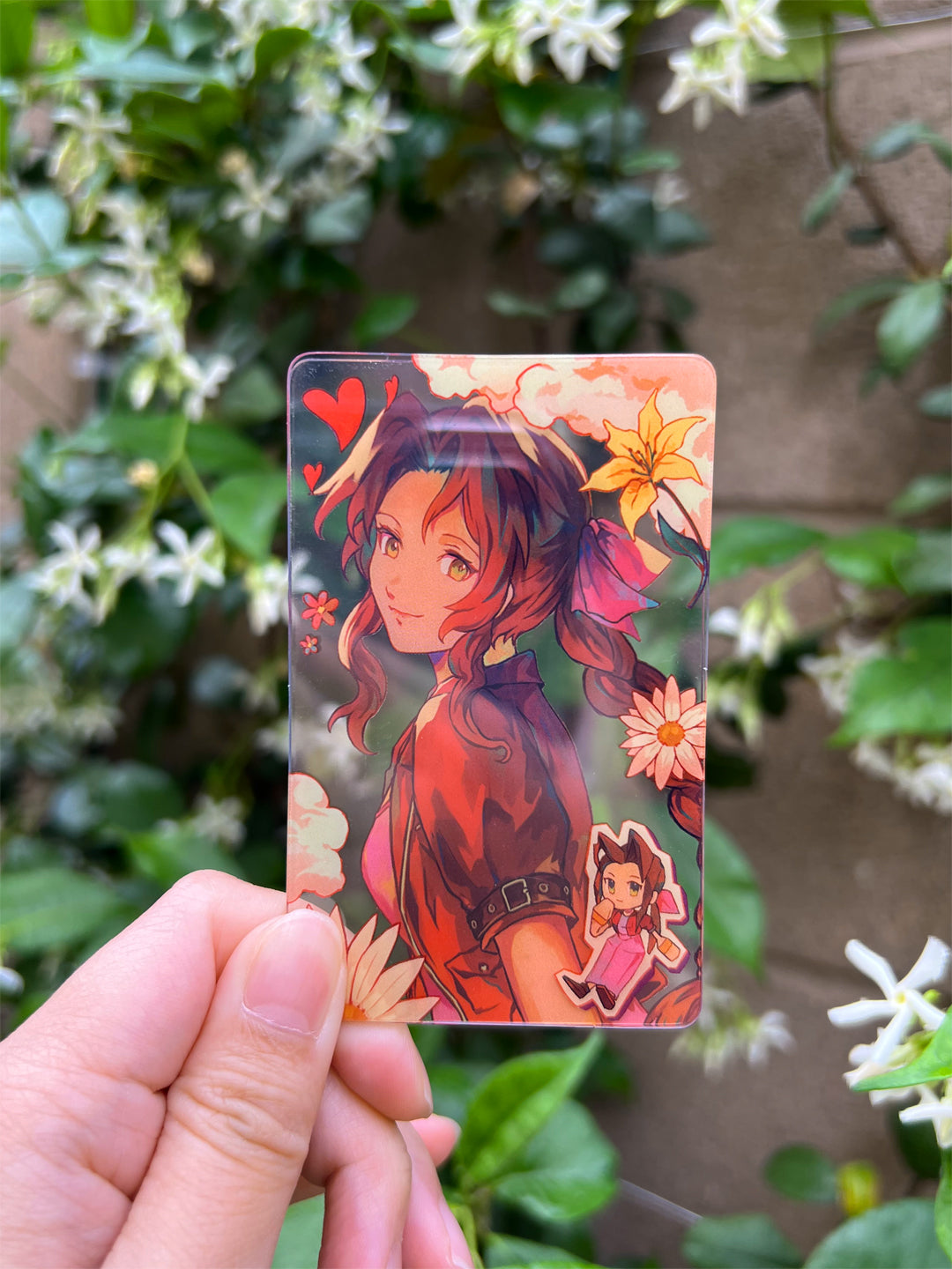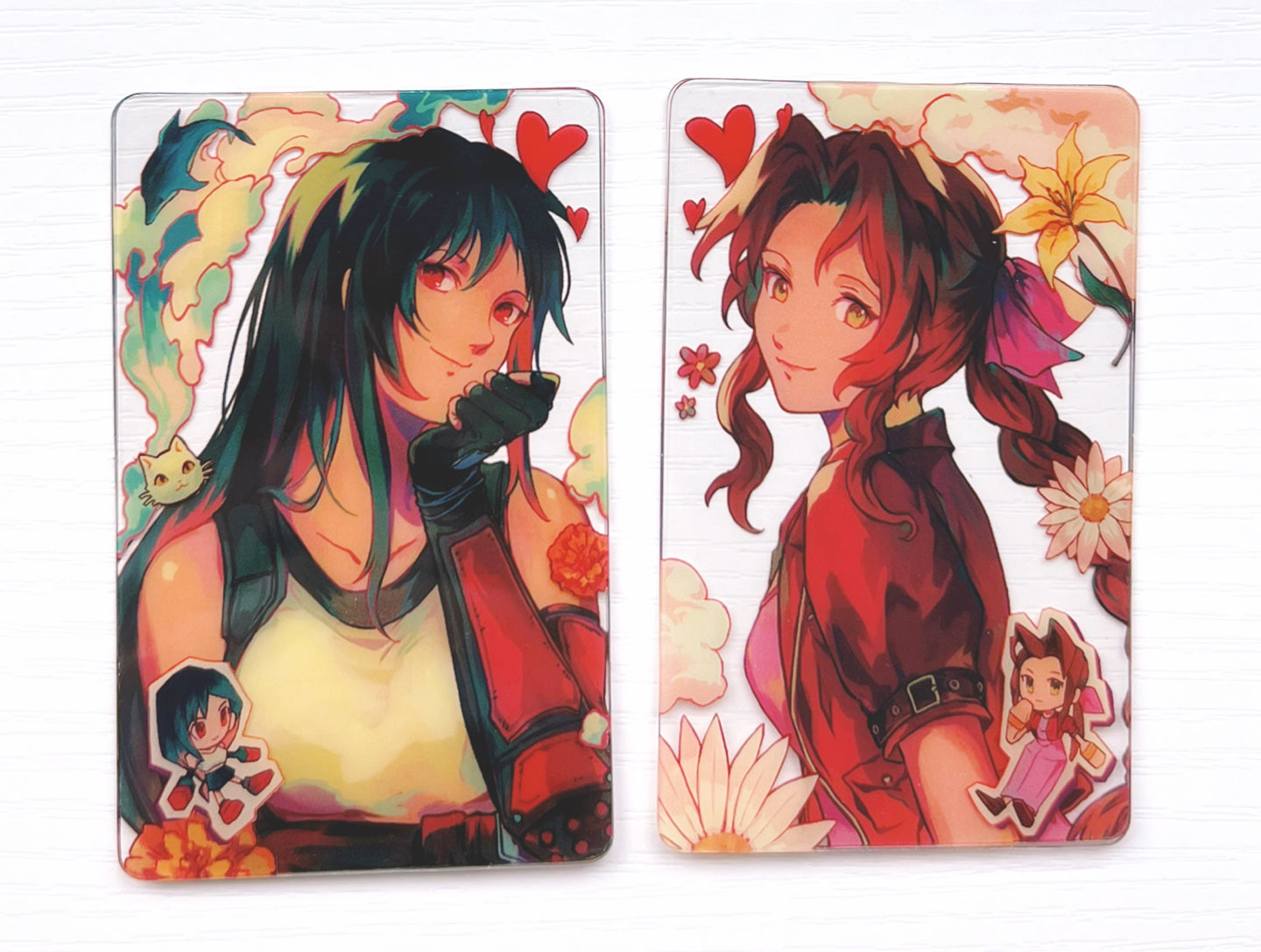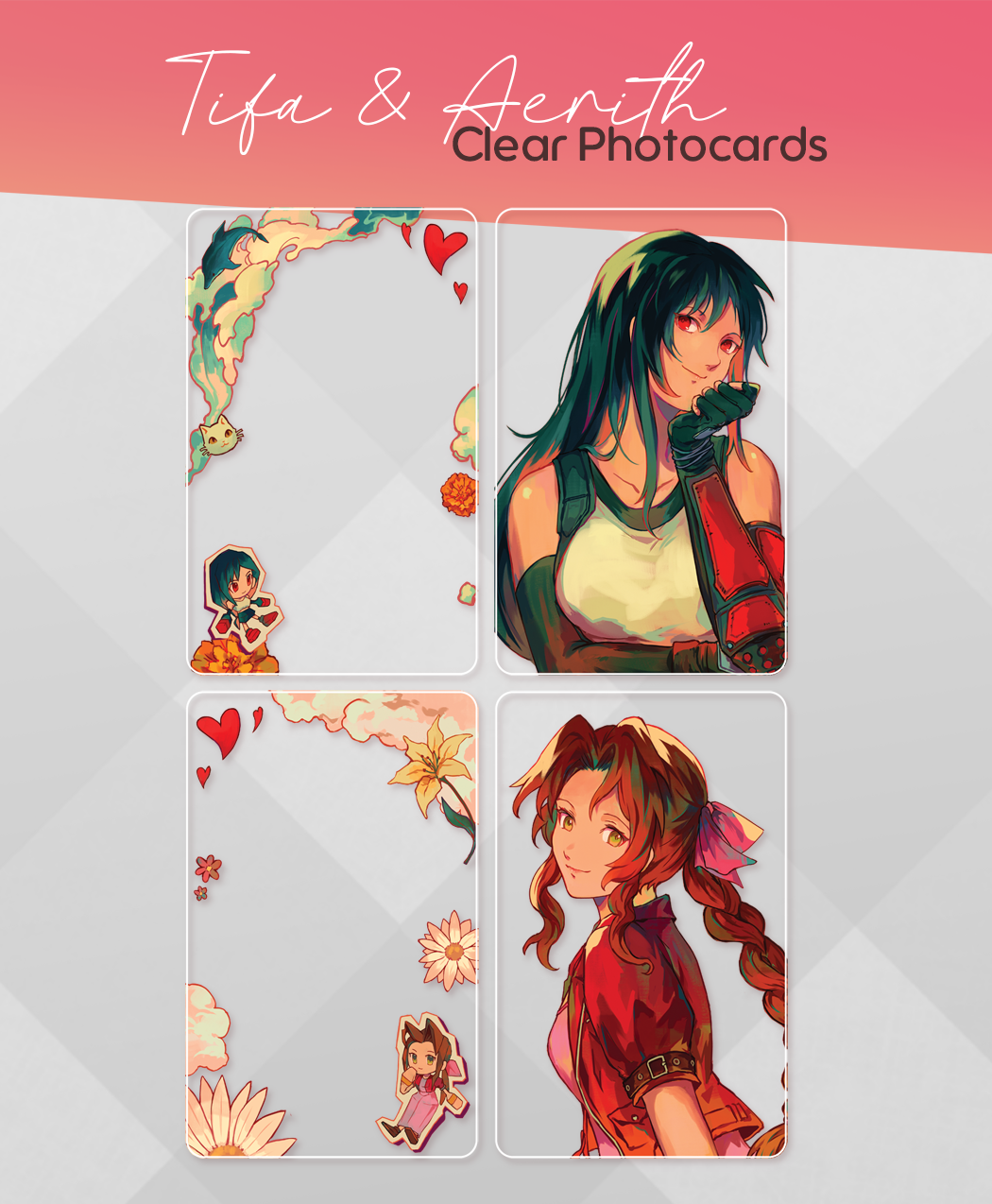 2x3.5" (approx. 5.08 x 8.89cm) clear photocards of Tifa & Aerith! Clear border photocards are available separately so you can use them to decorate an existing photocard or create fun little photoshoots❤️