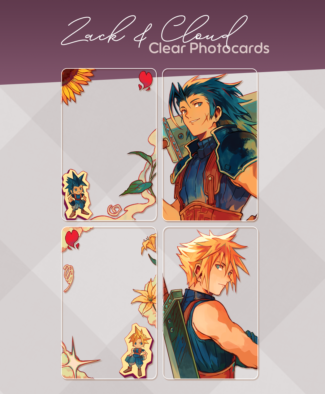 2x3.5" (approx. 5.08 x 8.89cm) clear photocards of Zack & Cloud! Clear border photocards are available separately so you can use them to decorate an existing photocard or create fun little photoshoots❤️