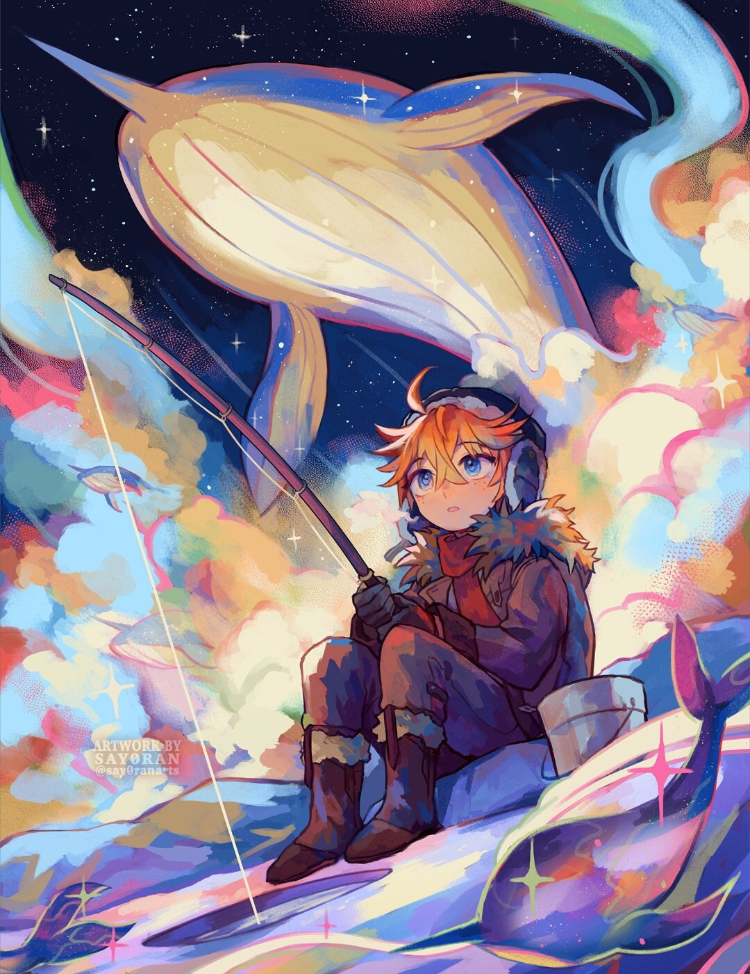 11x14" print (~28cm x 10cm) featuring small Childe among the whales, from Genshin Impact! The artwork is printed on sturdy, 80 lb. light cardstock matte paper.