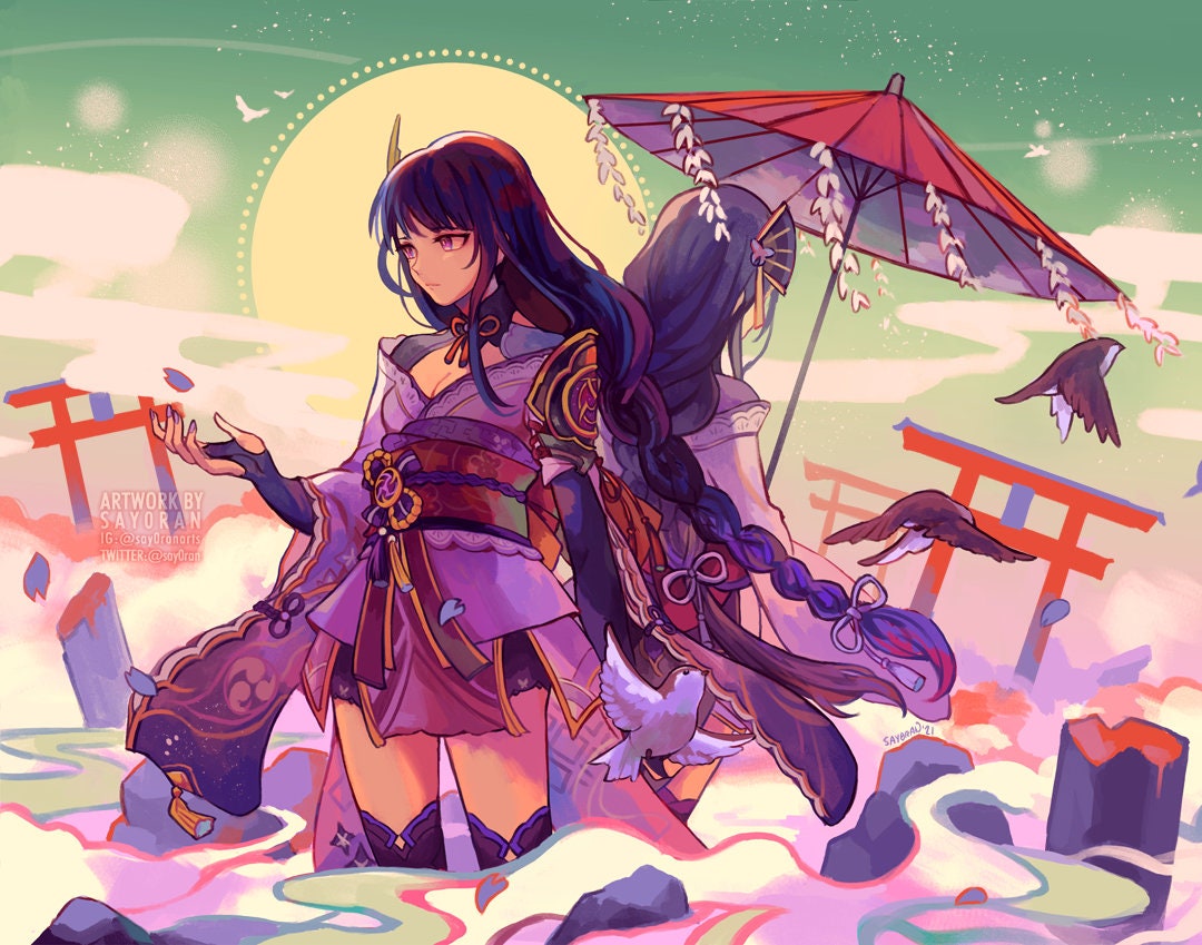11x14" print (~28cm x 10cm) featuring Ei and Makoto (Raiden Shogun) from Genshin Impact! The artwork is printed on sturdy, 80 lb. light cardstock matte paper.