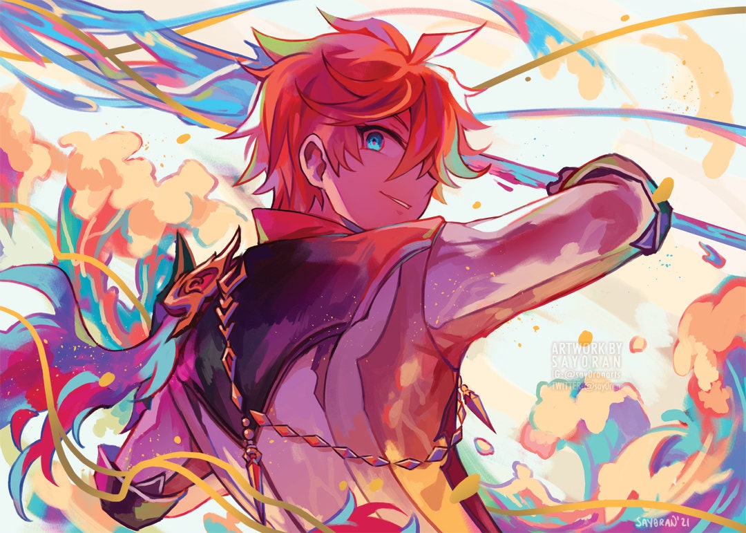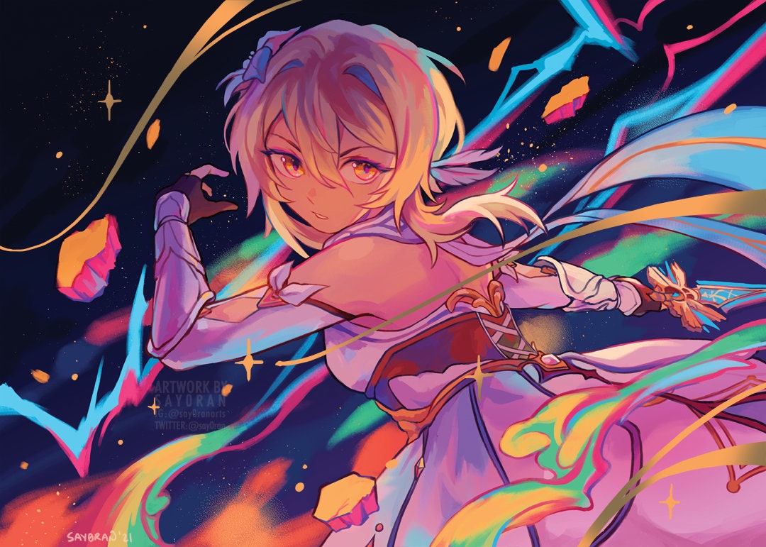 5x7" mini prints (~12.7cm x 17.78cm) featuring Lumine and Childe! The artwork is printed on sturdy, 80 lb. light cardstock matte paper, with gold foil accents.