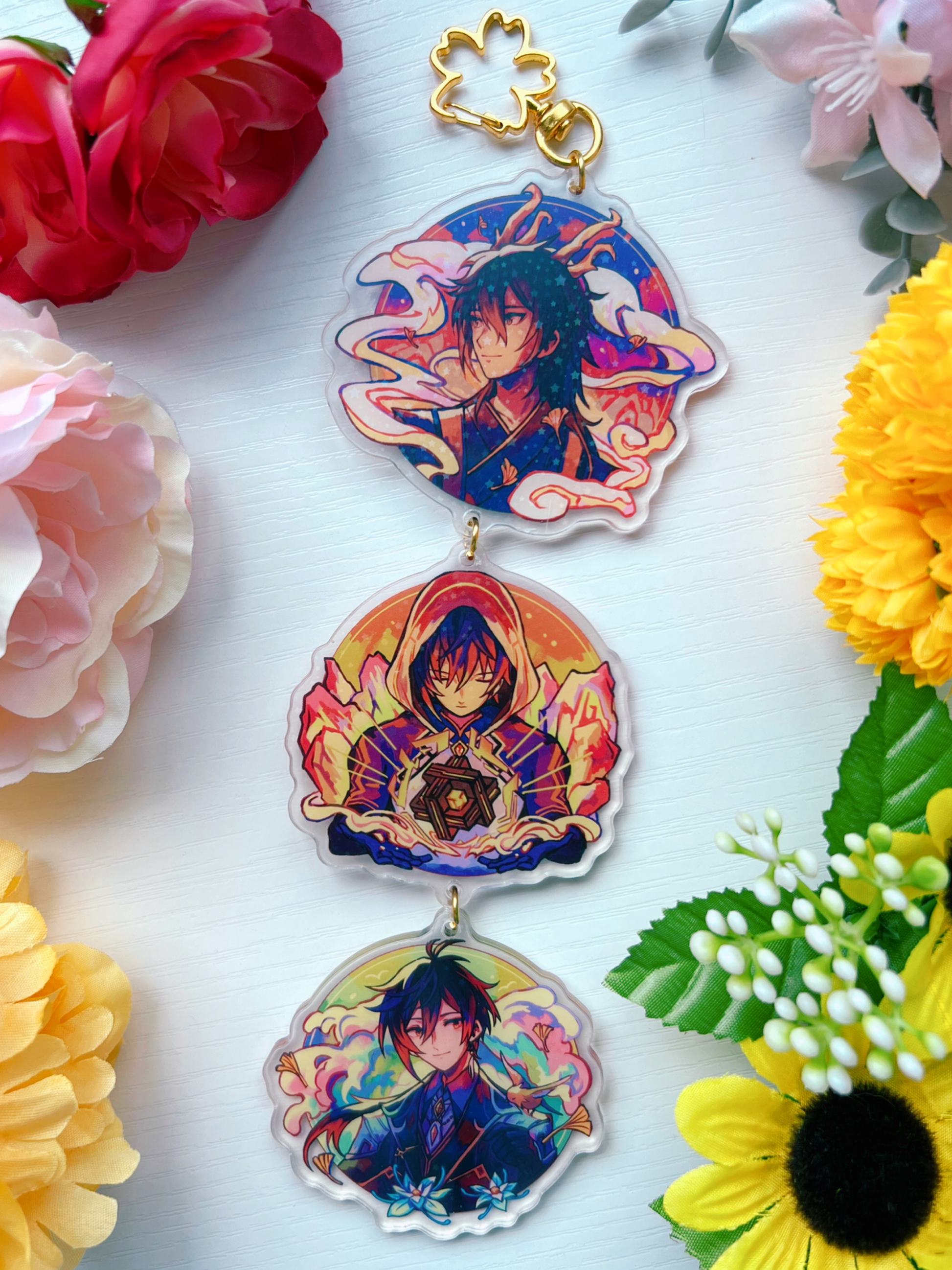Linked acrylic charms of Zhongli throughout his various stages of life; each charm measures to approximately 3 inches each.