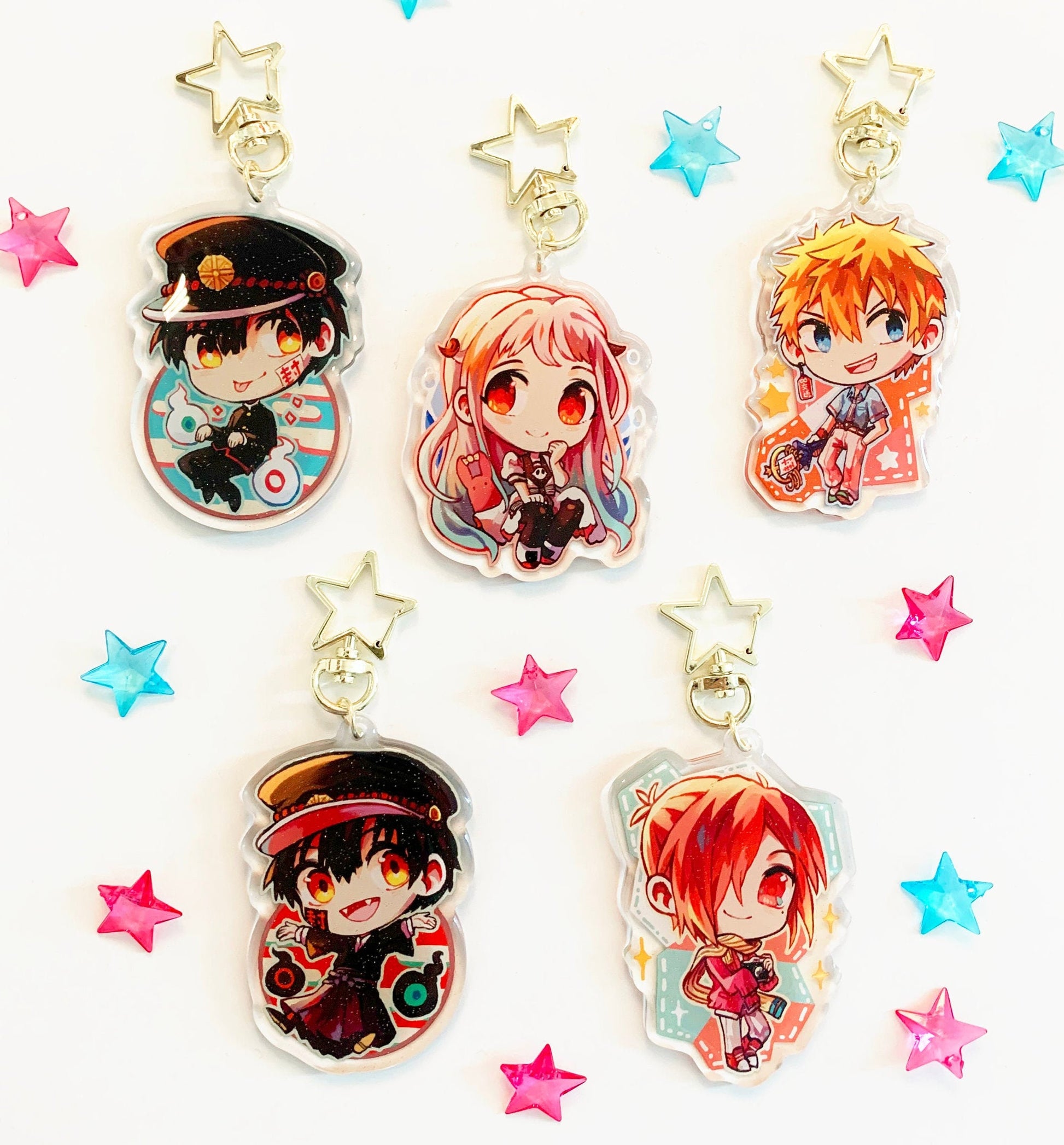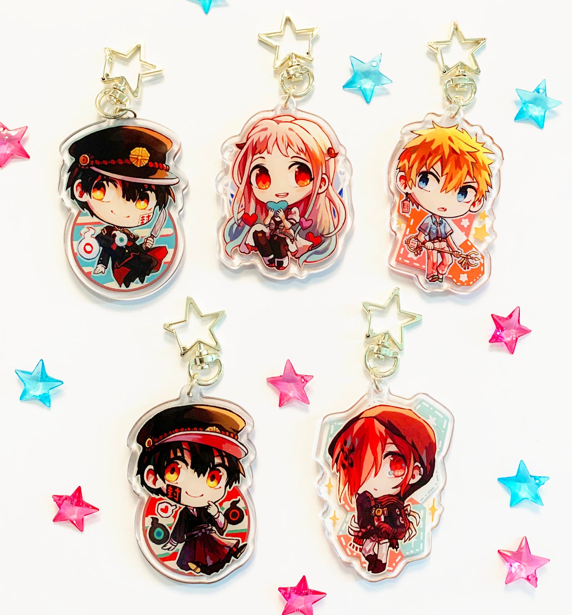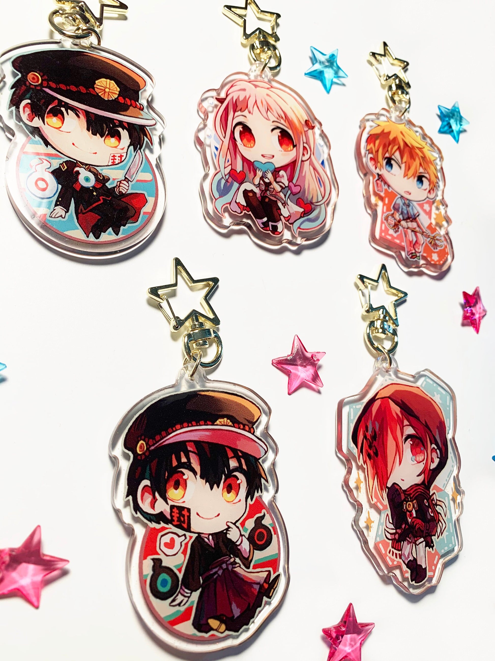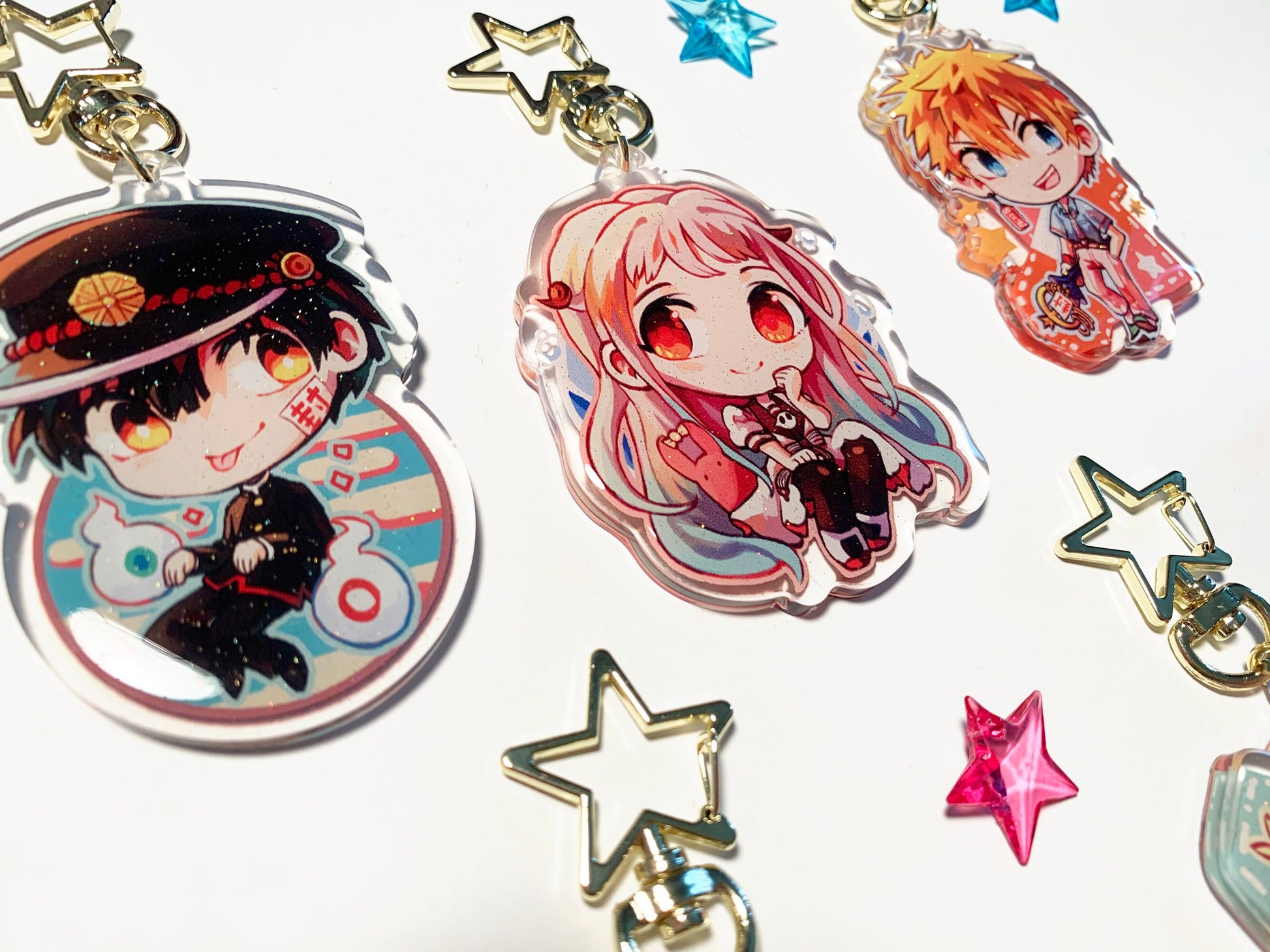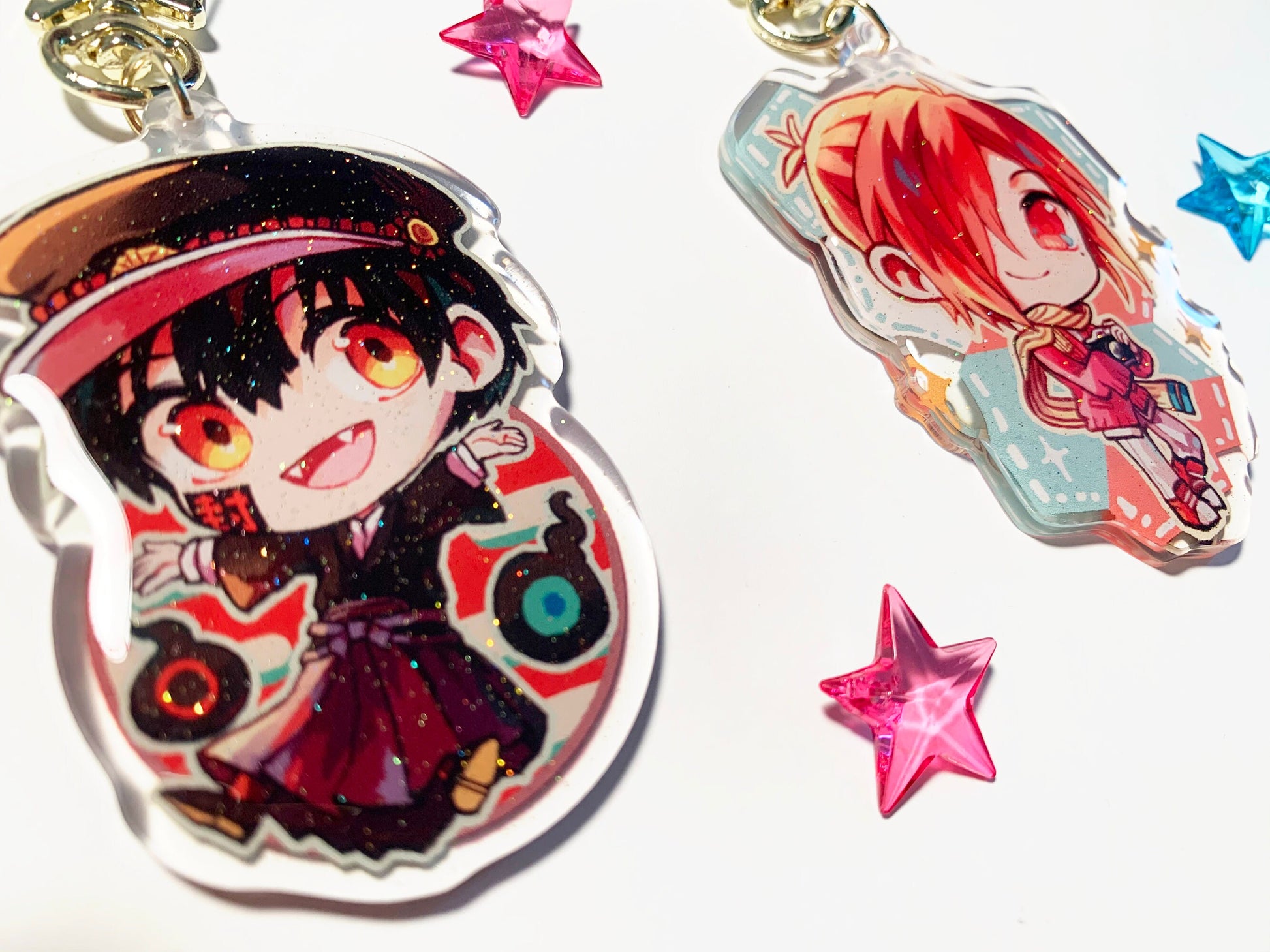 Glittery acrylic charms of the characters from Jibaku Shounen Hanako-kun: Hanako, Nene, Kou, Tsukasa, and Mitsuba! Each charm is double-sided and features different artwork on the back side.