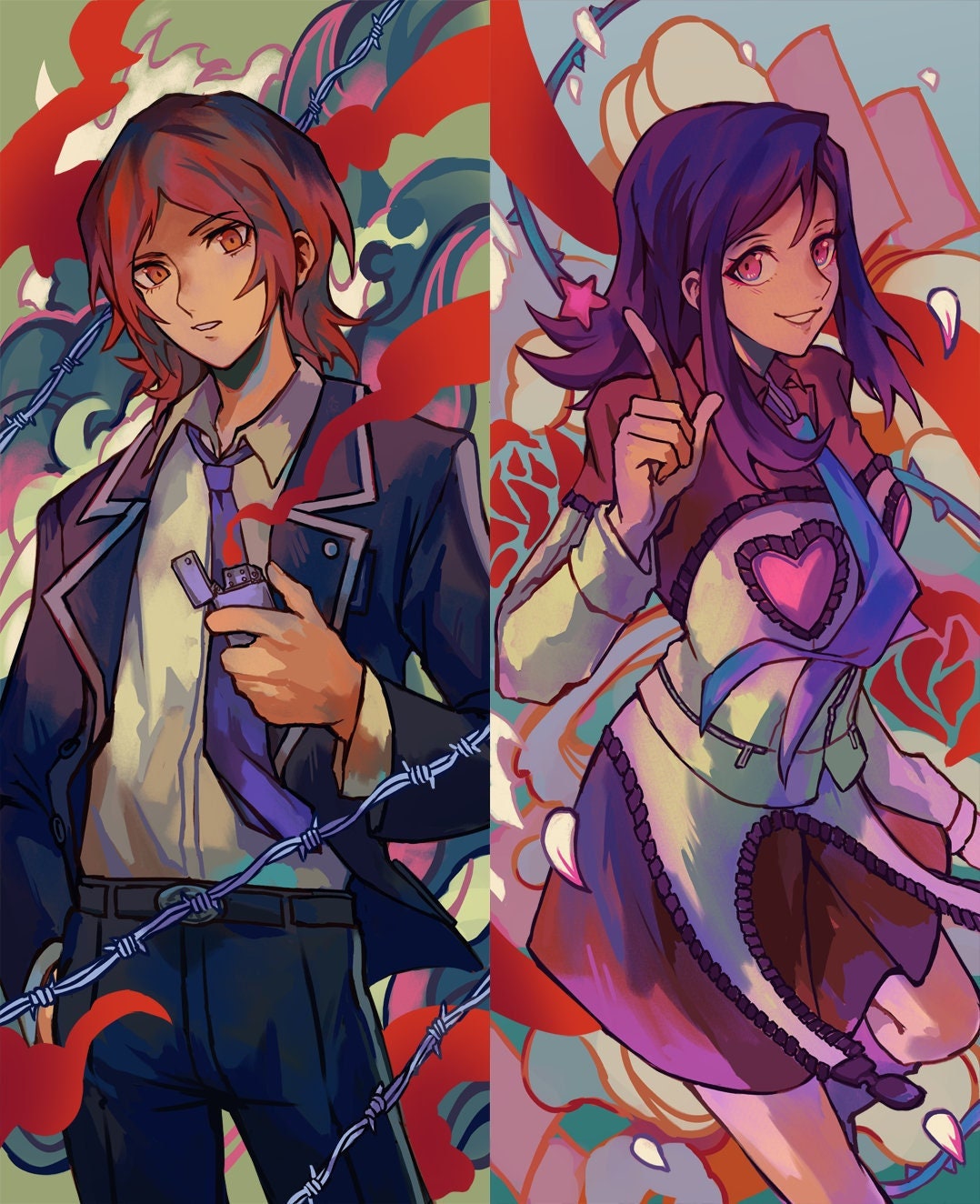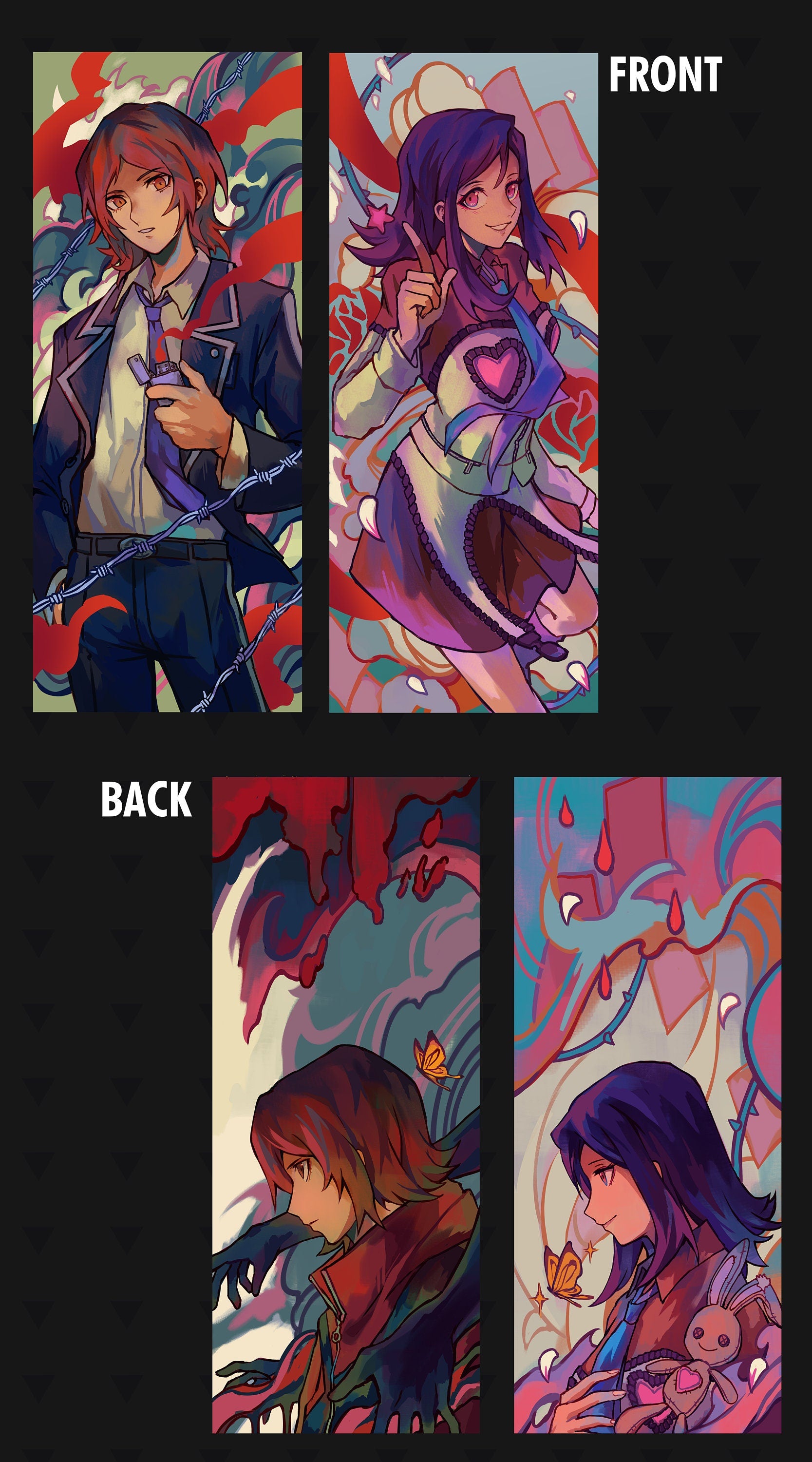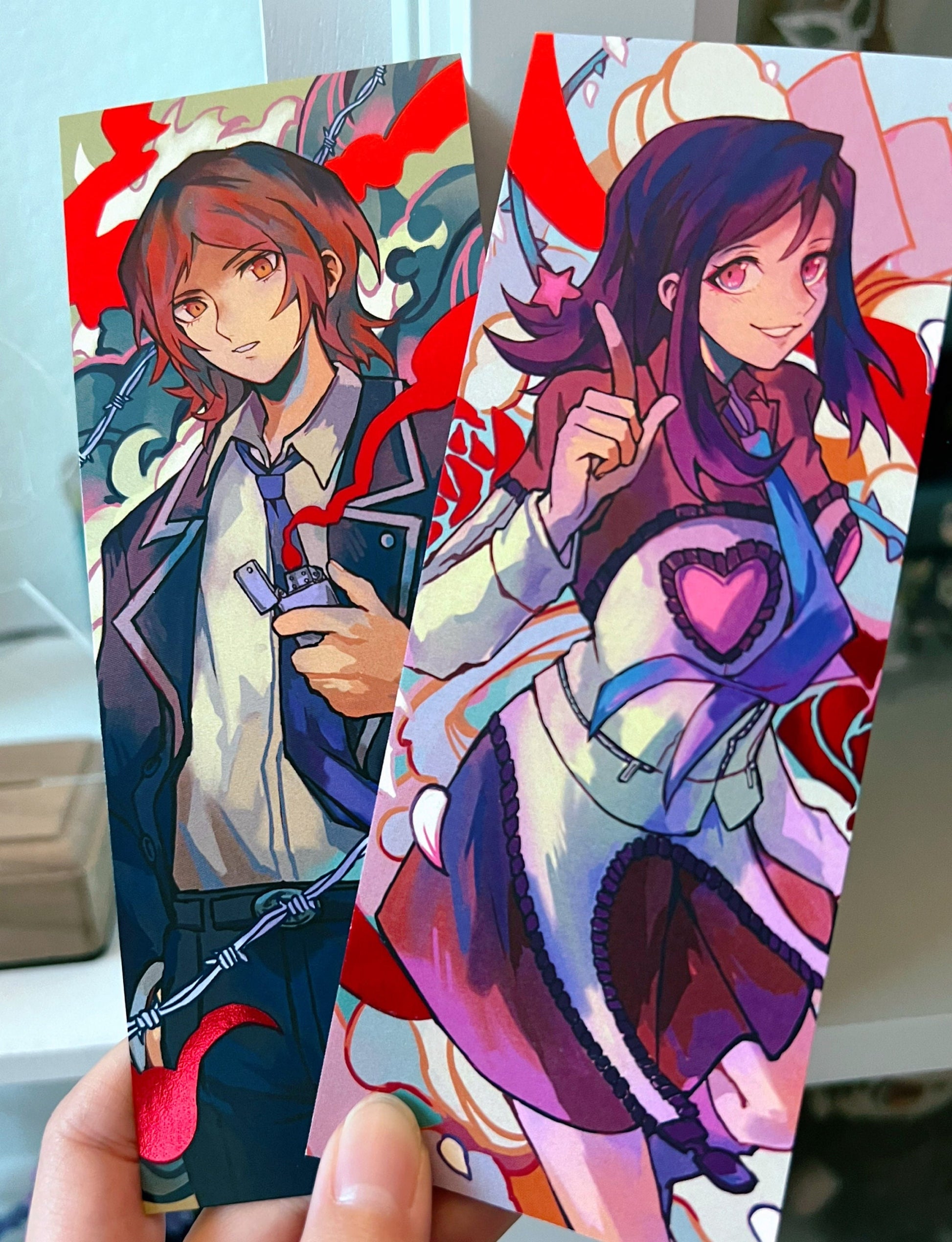 2.5x6.5" (~6.35cm x 16.5cm) bookmarks featuring Tatsuya and Maya from Persona 2! The artwork is printed on sturdy, 100 lb. cardstock matte paper with red foil accents plus additional artwork on the back side.