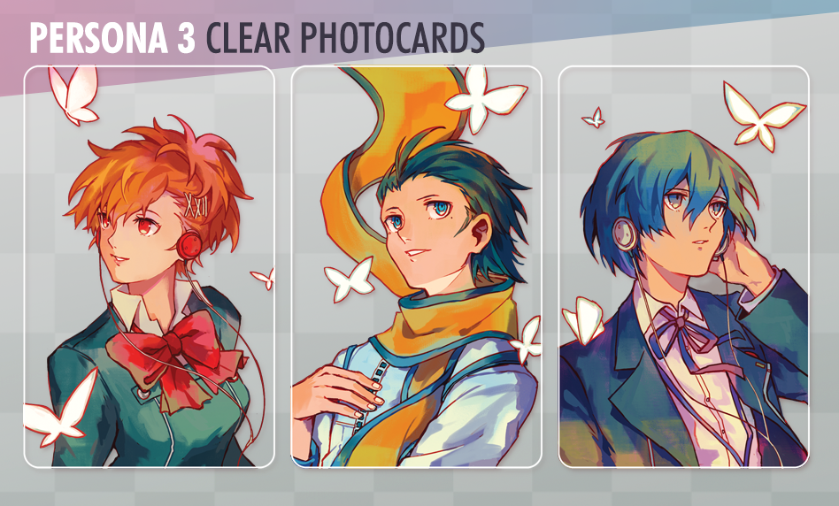 2x3.5" (approx. 5.08 x 8.89cm) clear photocards of Ryoji, the male, and female protagonists of Persona 3.
