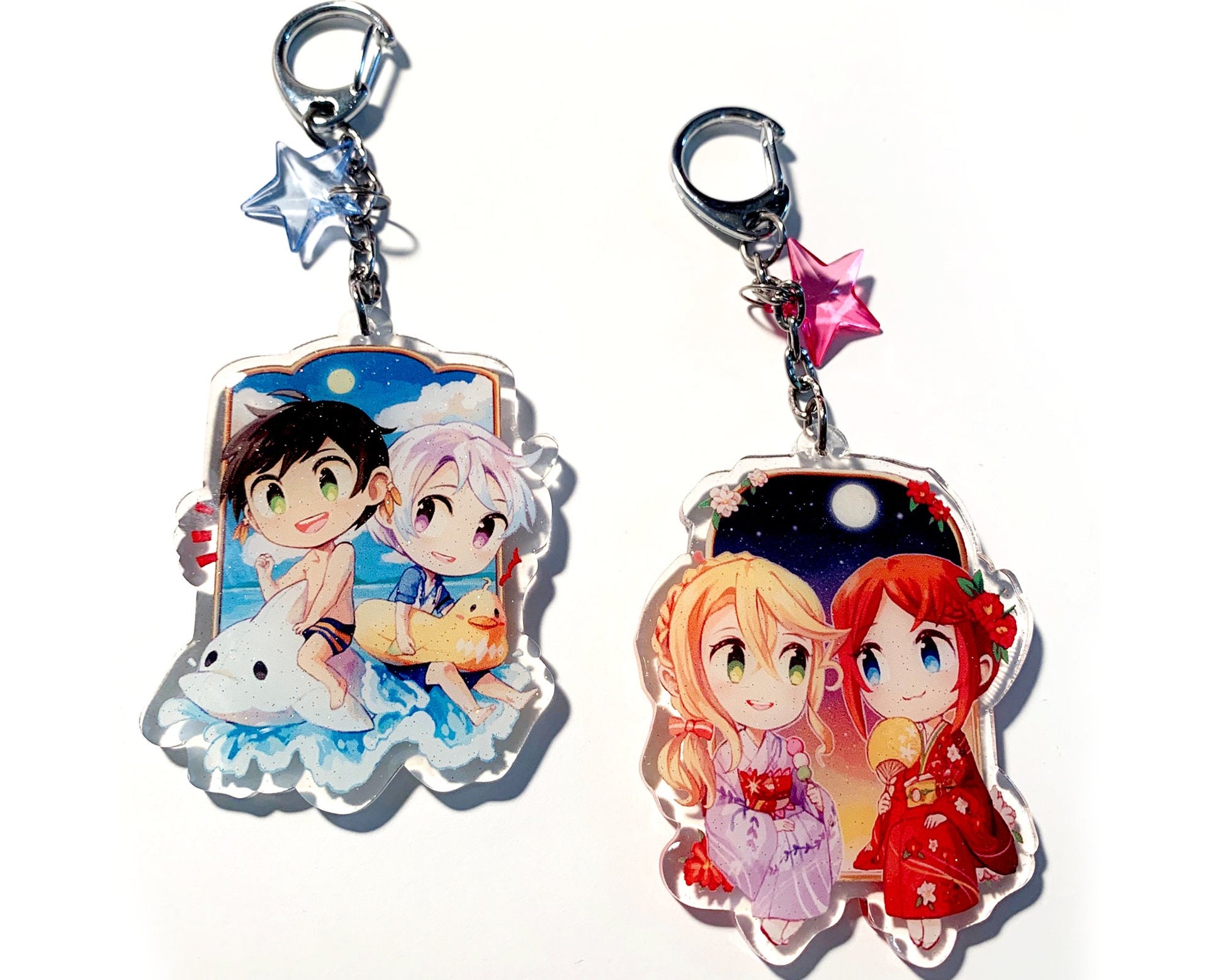 Acrylic charms featuring some summer fun for Sorey and Mikleo and a lovely starry night for Rose and Alisha!